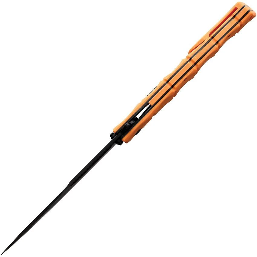 Model/Part Number – CS20NQXORBK. Cold Steel Knives Large Luzon Linerlock Org. 7.5″ (19.05cm) closed. 6″ (15.24cm) black finish 8Cr13MoV stainless clip point blade. Orange GFN handle. Extended tang. Lanyard hole. Thumb stud. Boxed. Made in China.