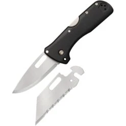 Model – CS40BA. Cold Steel Click-N-Cut Lockback. 2.5″ (6.35cm) 420J2 stainless blade. Black ABS handle. Lanyard hole. Comes with bowie and serrated utility blades. Black ABS belt sheath. Hang packaged. Made in Taiwan.