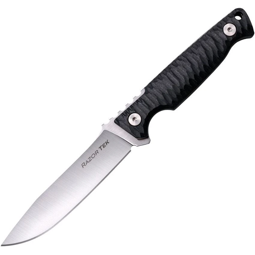 Model – CSFX4RZR. Cold Steel Razor Tek. 8″ (20.32cm) overall. 4″ (10.16cm) satin finish 4116 stainless clip point blade. Black sculpted GFN handle. Full tang. Lanyard hole. Black Secure-Ex belt sheath. Boxed. Made in Taiwan.