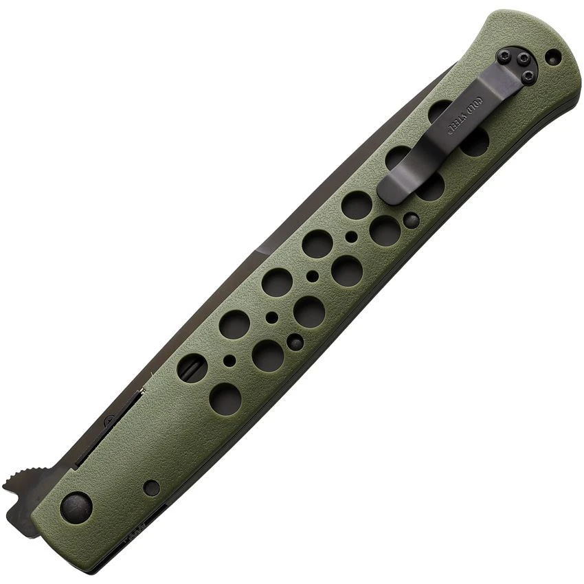 Model/Part Number – CS26SXPODBK. Cold Steel Knives Ti-Lite Linerlock OD. 7.13″ (18.11cm) closed. 5.88″ (14.94cm) black finish AUS-8A stainless blade. OD green Zytel handle. Extended tang. Pocket clip. Thumb stud. Made in Taiwan.